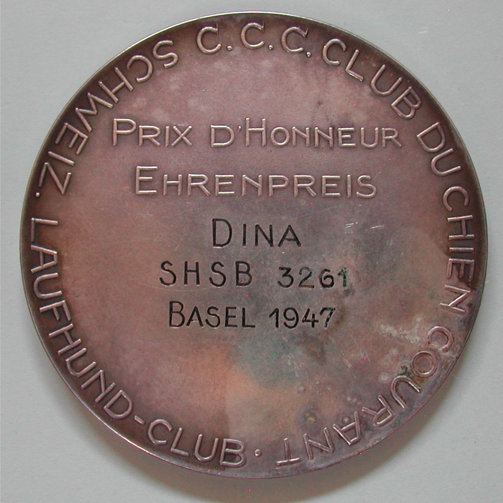 RS: SCHWEIT. LAUFHUND-CLUB • C.C.C. CLUB DU CHIEN COURANT •, PRIX D’HONNEUR / EHRENPREIS / eingraviert: DINA / SHSB 3261 / BASEL 1947