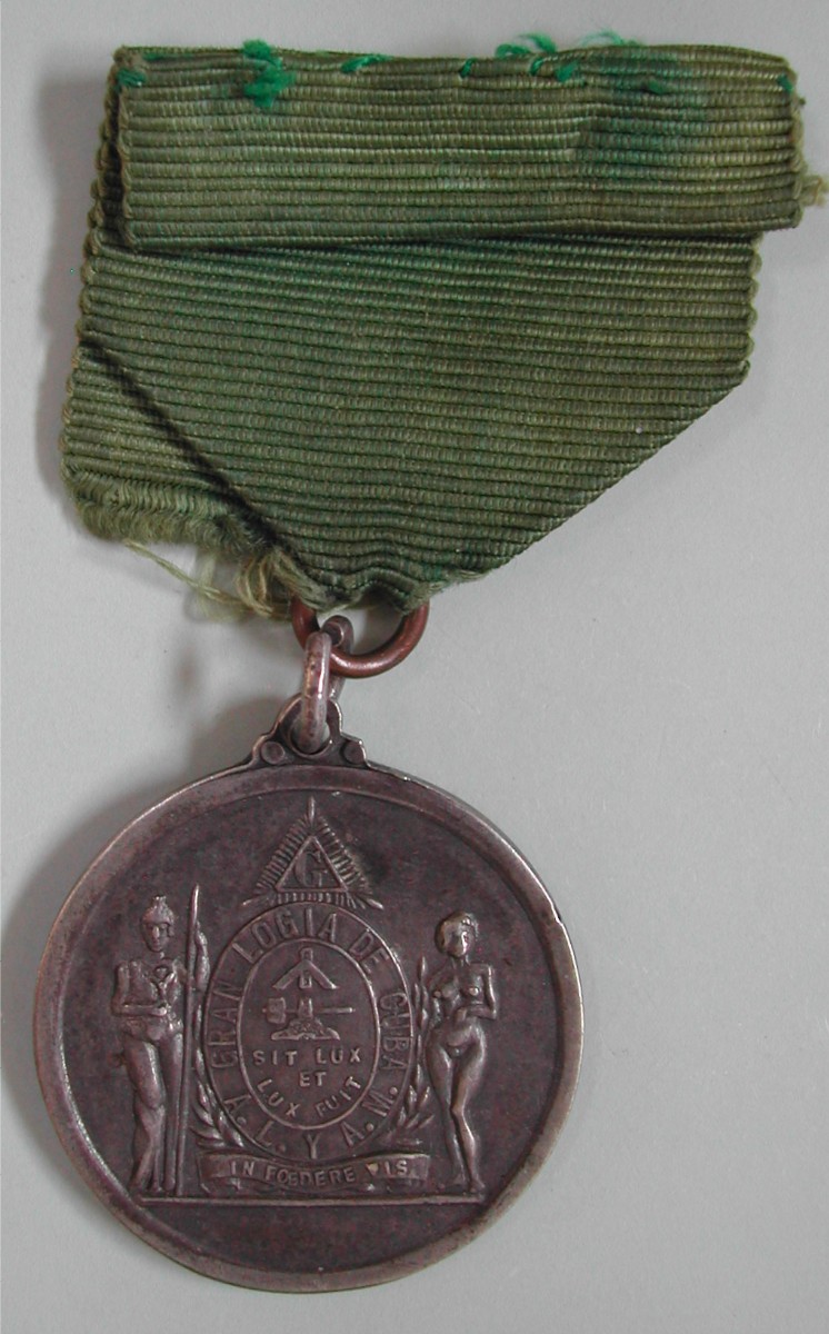 AS: 2 Figuren halten ovalen Schild mit G in strahlendem Dreieck, GRAN LOGIA DE CUBA, A.L. Y A.M., SIT LUX / ET / LUX FUIT, unten: IN FOEDERE VIS