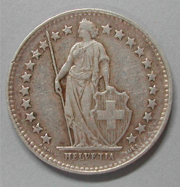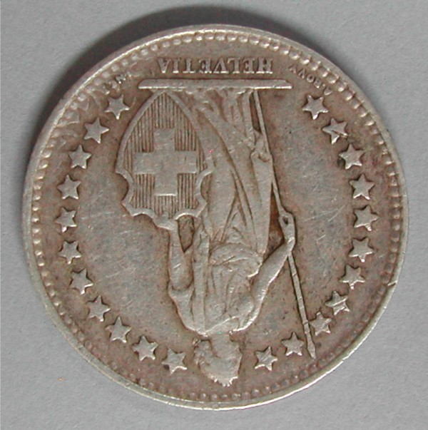 AS: stehende Helvetia mit Schild und Speer zwischen Sternen, in Ex: A BOVY – HELVETIA – INC T., ABART: gezeichneter Stempel unten rechts