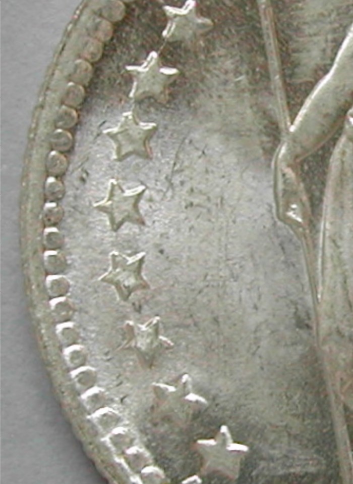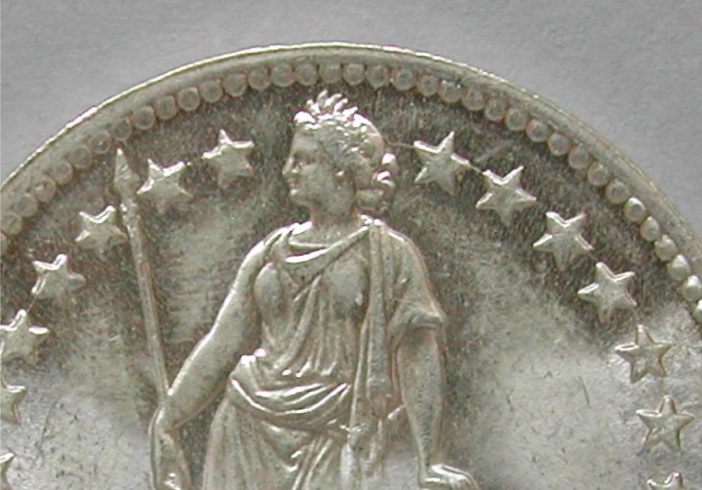 AS: stehende Helvetia mit Schild und Speer zwischen Sternen, in Ex: A BOVY – HELVETIA – INC T., ABART: feine Stempelrisse durch Sterne links und rechts