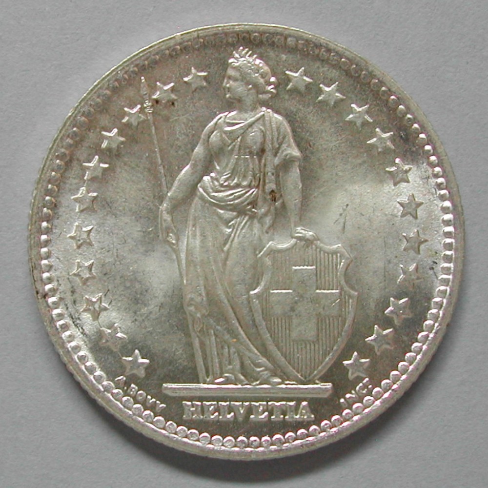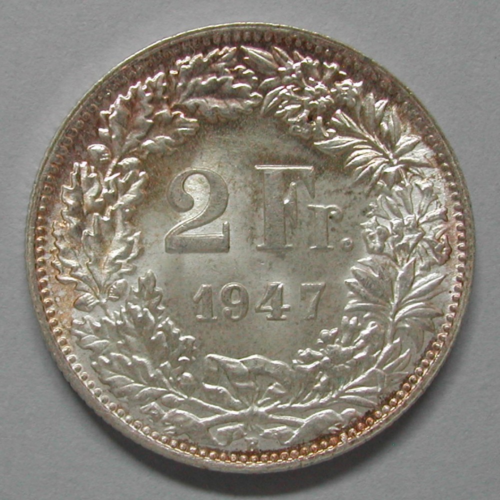 2 FRANKEN 1947 B, Ag 835, 9.96(2) gr., d027mm, Stempelriss, vz-unz