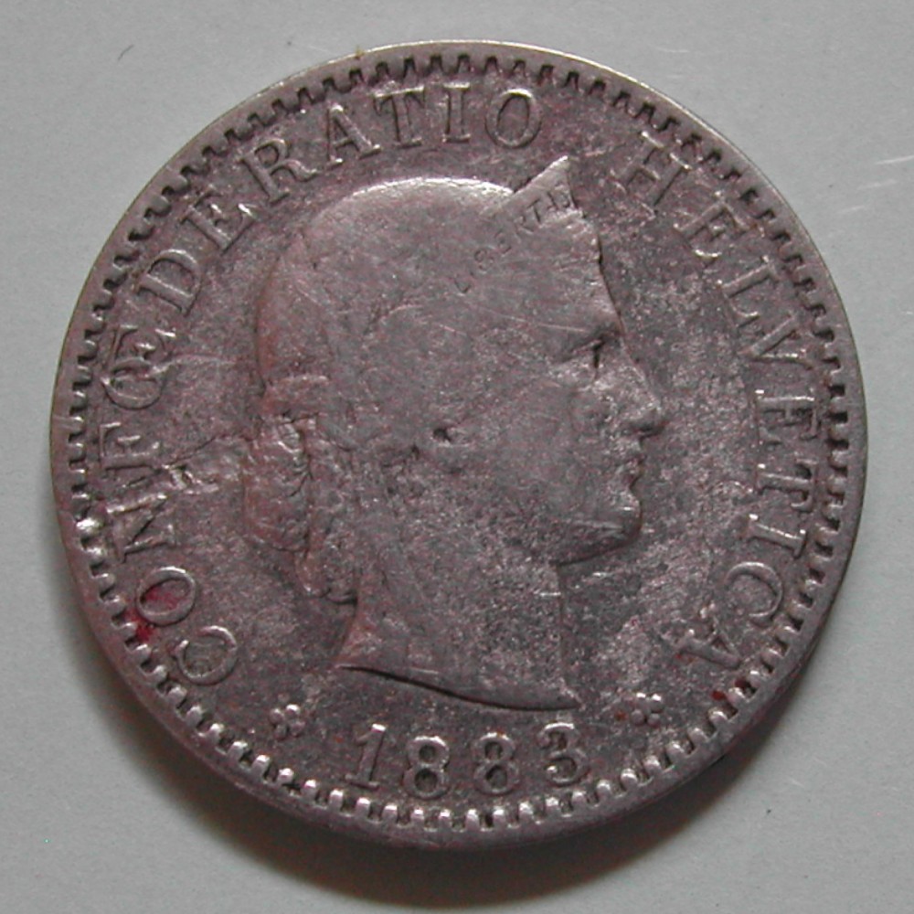 AS: CONFOEDERATIO HELVETICA ✤ 1883 ✤, jugentlicher Frauenkopf nach rechts, Diadem mit: LIBERTAS, ABART: Kremdkörpereindruck hinter dem Kopf