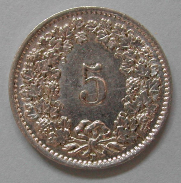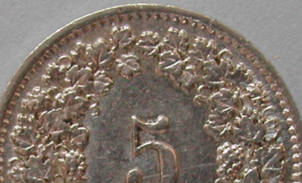 RS: 5 im Weinrebenkranz, unter Schleife: B (Bern), ABART: Doppelprägung 2/3 oben im Bereich der Weinreben und die ganze 5 + Stempelrisschen 4.30h Rand