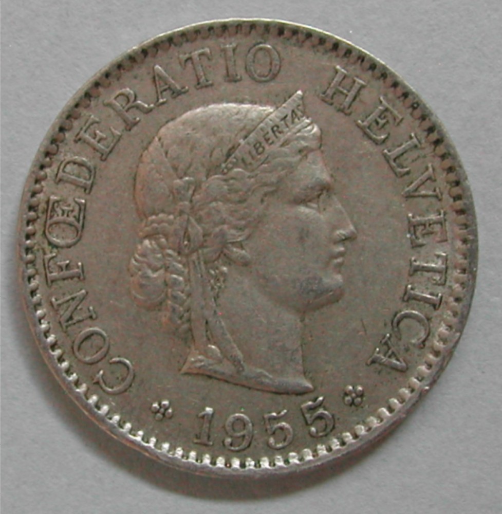 AS: CONFOEDERATIO HELVETICA ✤ 1955 ✤, jugentlicher Frauenkopf nach rechts, kleiner Stempelriss Rand – L
