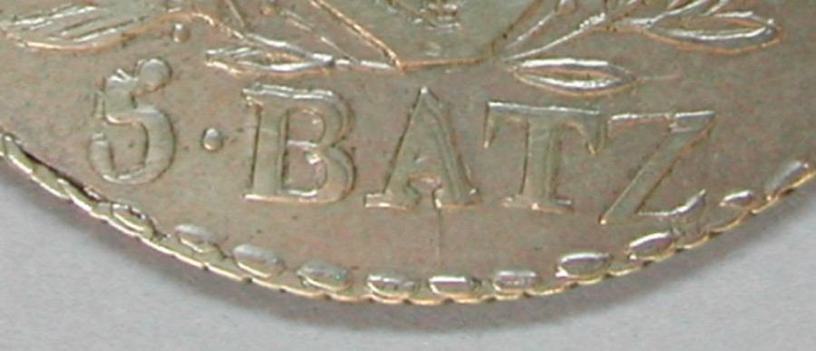 AS: CANTON AARGAU 1826, Wappen zwischen Lorbeerzweigen, unten: 5 • BATZ •