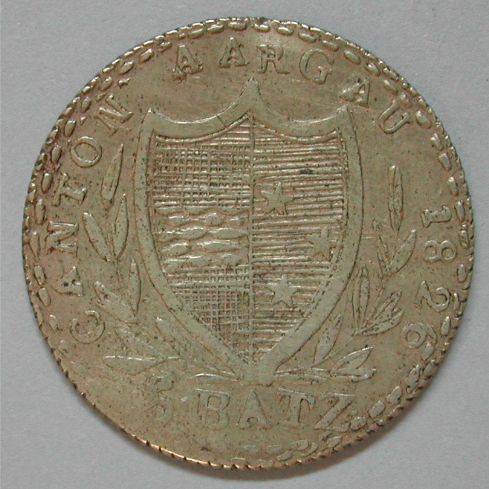 AS: CANTON AARGAU 1826, Wappen zwischen Lorbeerzweigen, unten: 5 • BATZ •