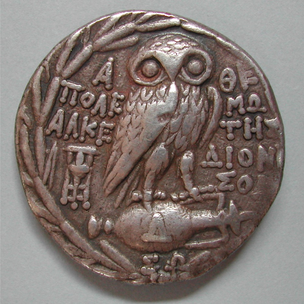 RS: Eule steht auf Amphore, A – THE / POLE – MO / ALKE – TIS / DIONISO(?), links Monogramm, auf Amphore Delta, unden SO (Schrift in griechisch) Olivenzweigkranz