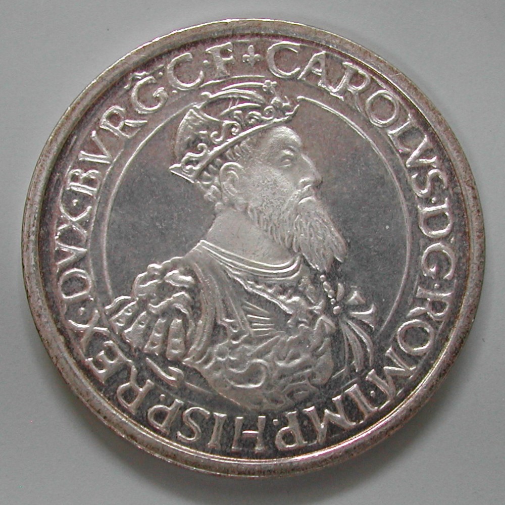 AS: CAROLVS D G ROM IMP HISP REX DVX BVRG C F+, Büste des gekrönten Herrschers nach rechts