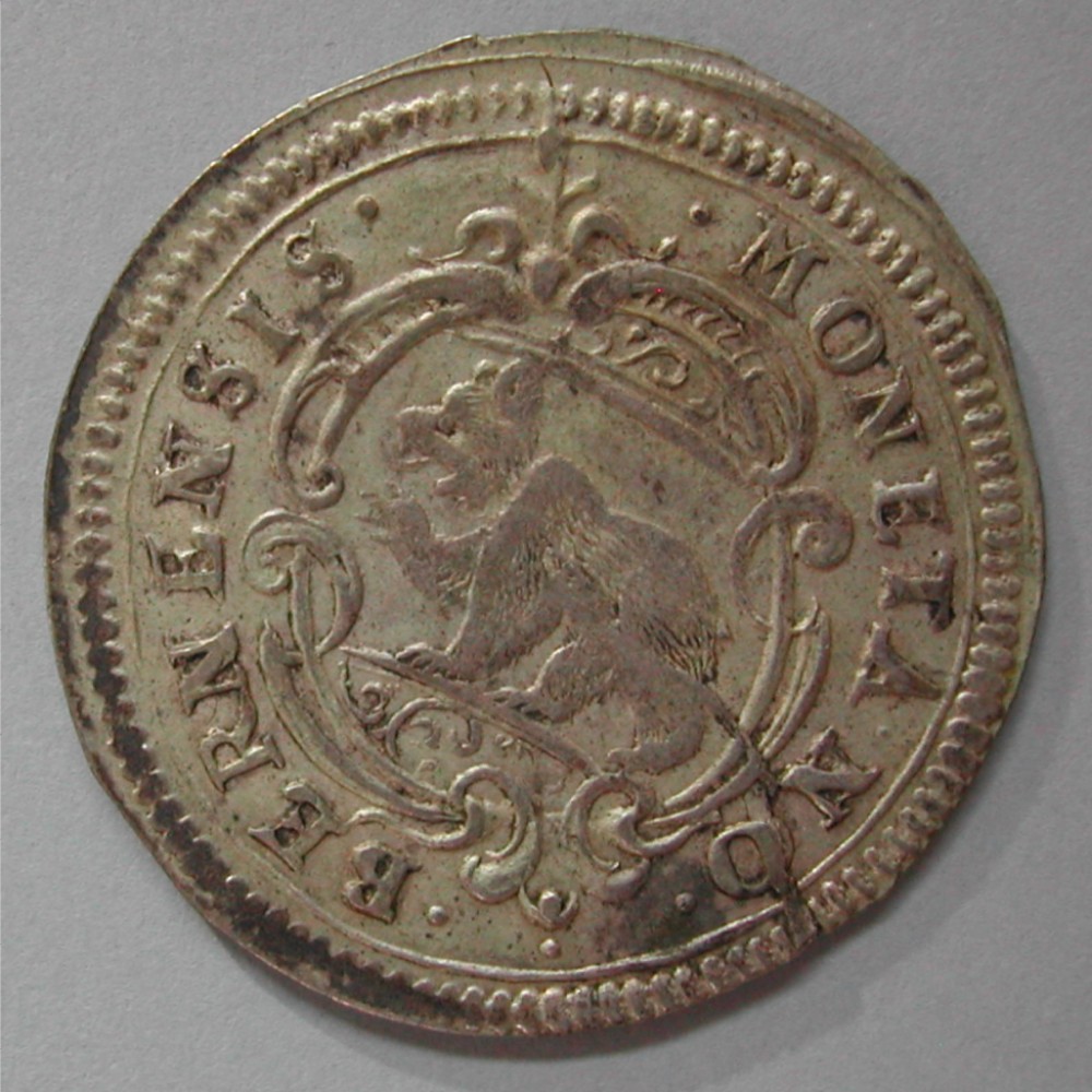 AS: • MONETA • NO • • • BERNENSIS •, Wappen in Kartouche, oval, ABART: St. Riss von Rand – NO bis Schulter Bär