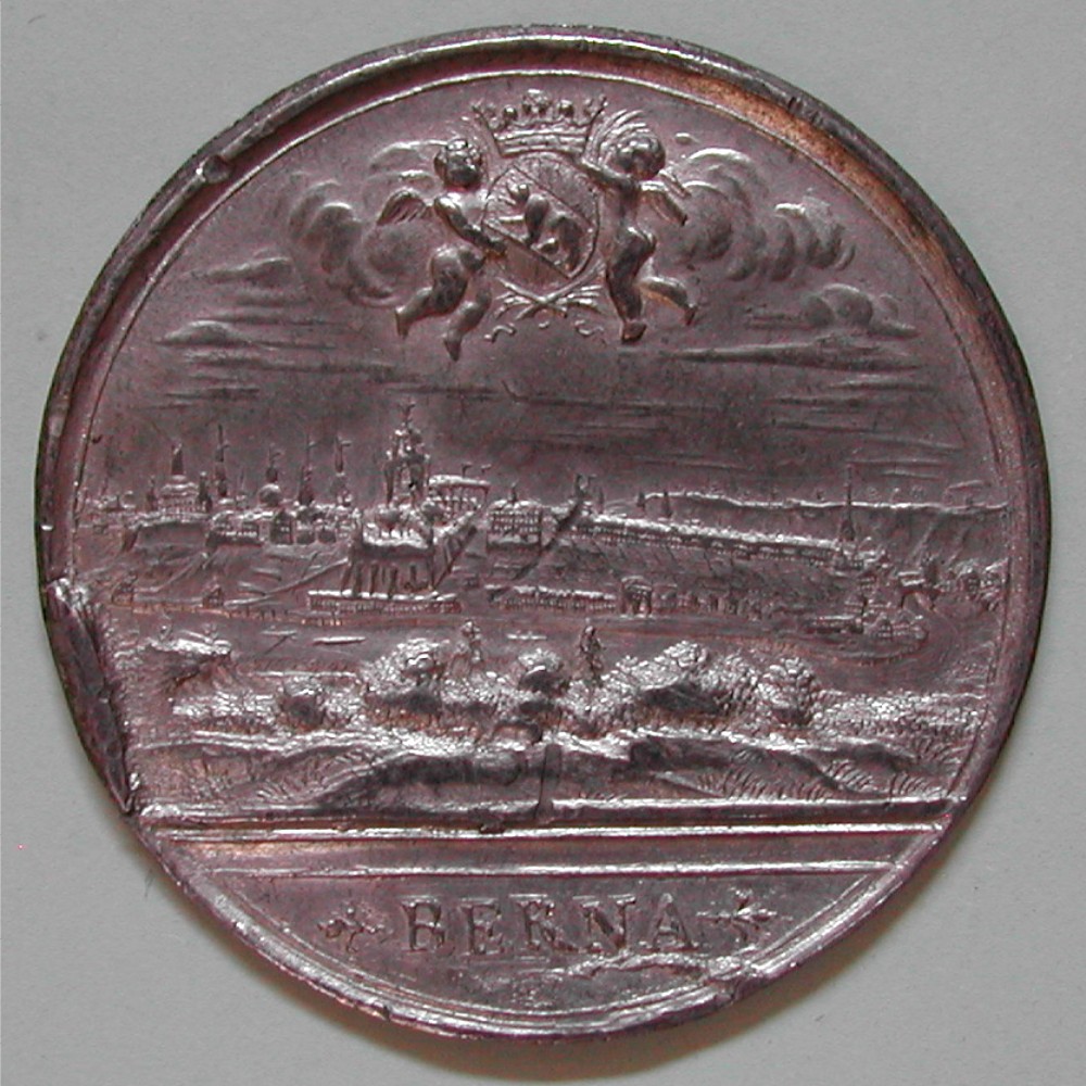 AS: gekröntes Wappen von 2 Engeln gehalten über Stadtansicht von den englischen Anlagen aus gesehen, in Ex: BERNA