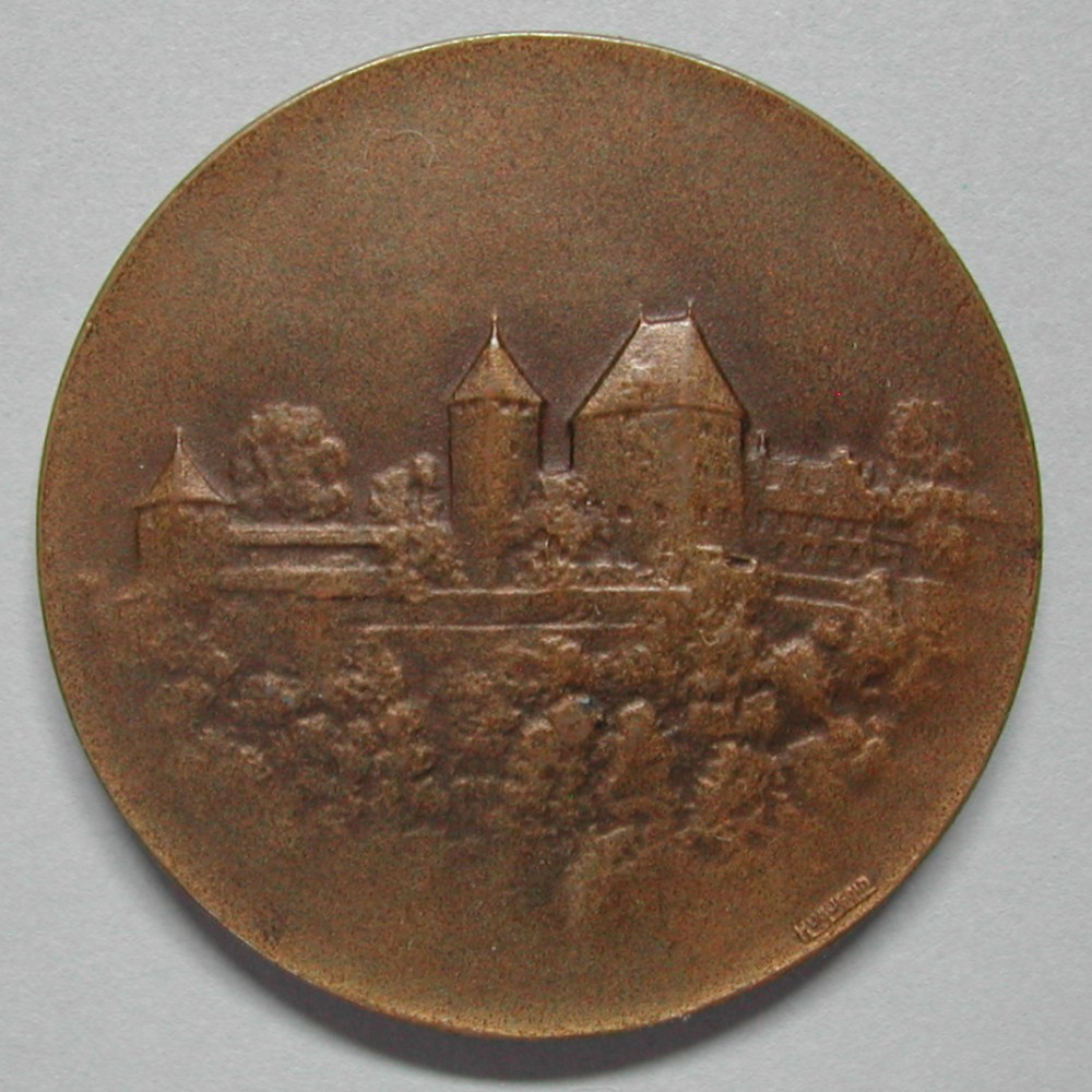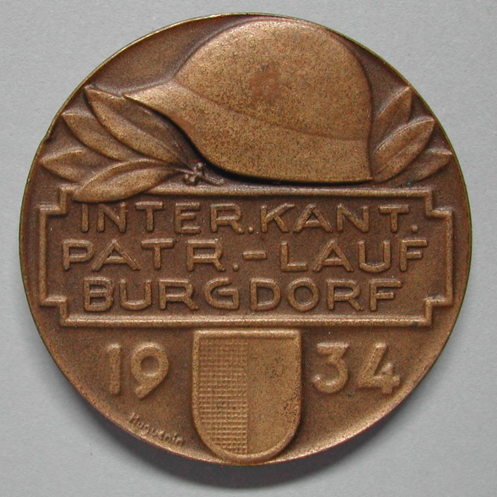 RS: Helm auf Lorbeer über Tafel: INTER.KANT. / PATR.-LAUF / BURGDORF, darunter: 19-Wappen-34, sig: HUGUENIN
