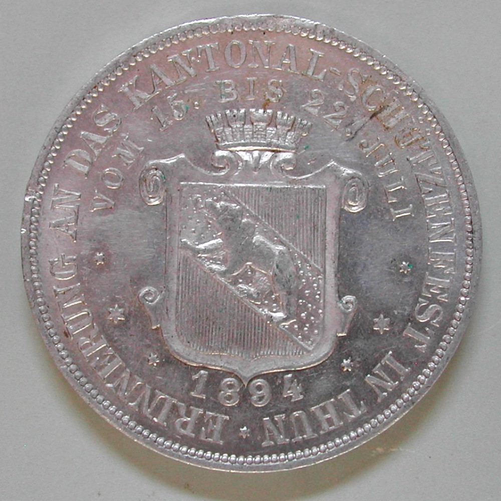 AS: ERINNERUNG AN DAS KANTONAL SCHÜTZENFEST IN THUN / VOM 15. BIS 22. JULI • ✶ • 1894 • ✶ •, gekröntes Wappen im Felf