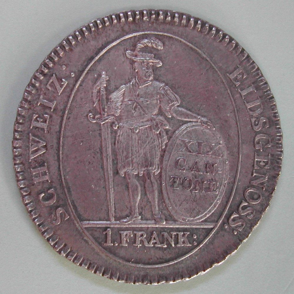RS: SCHWEIZ : – EIDGENOSS :, im Oval stehender Landknecht mit Schwert und Schild, darauf: XIX / CAN / TONE, in Ex: 1.FRANK: