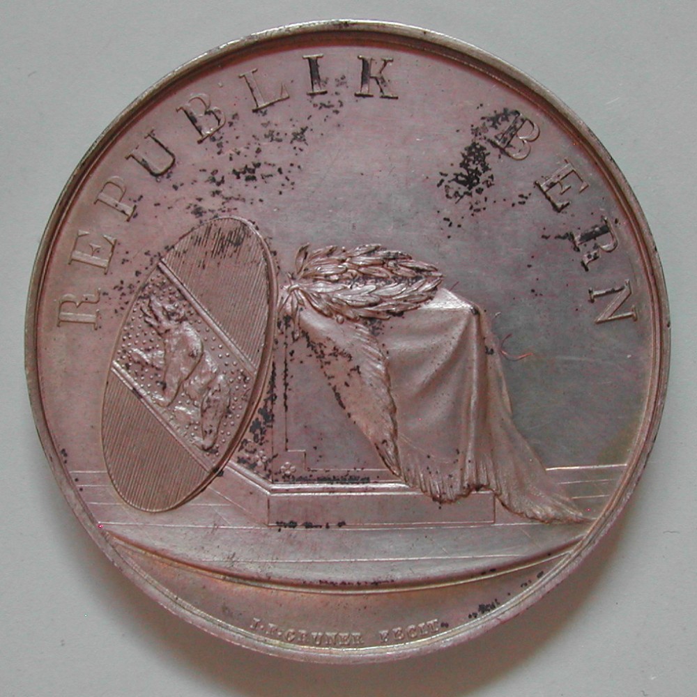 AS: REPUBLIK BERN, Lorbeerkranz auf mit Mantel bedecktem Altar, daran angelehnt der ovale Stadtschild; im Abschnitt die Stempelschneidersignatur I·F·GRUNER FECIT