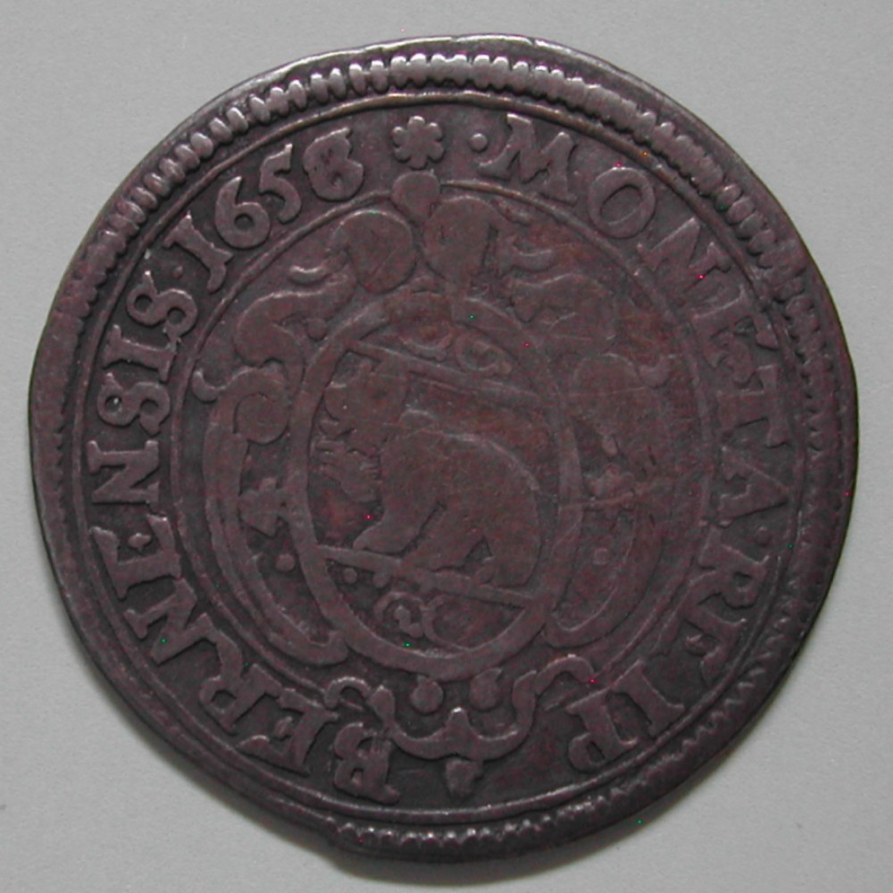 AS: MONETA : REIP – BERNENSIS 1656/8 ✱ •, Bär im ovalen Schild mit damaszierten Feldern inverschnörkelter Kartusche