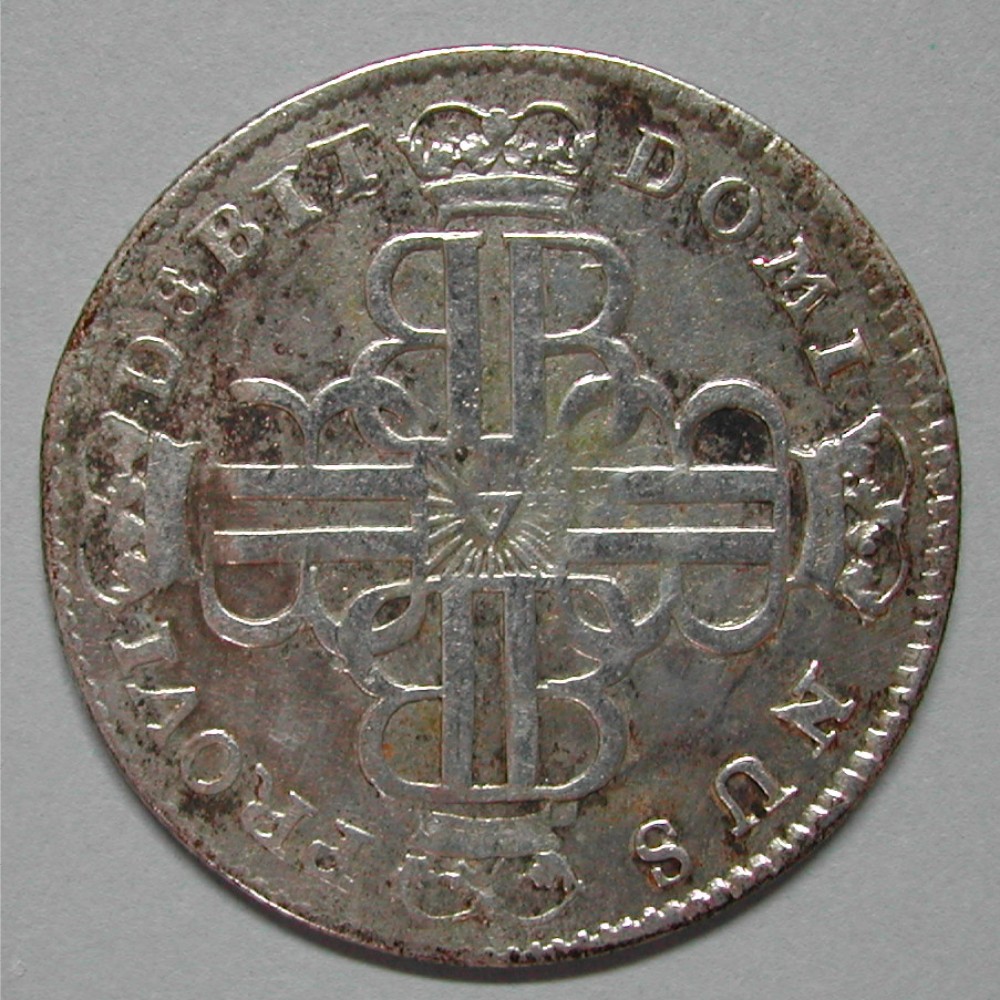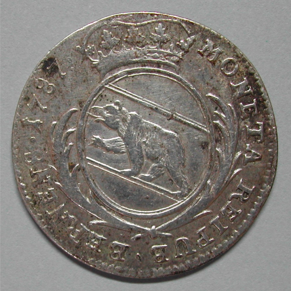 AS: MONETA REIPUB・BERNENS・1758, gekröntes, ovales Wappen zwischen Palmzweigen