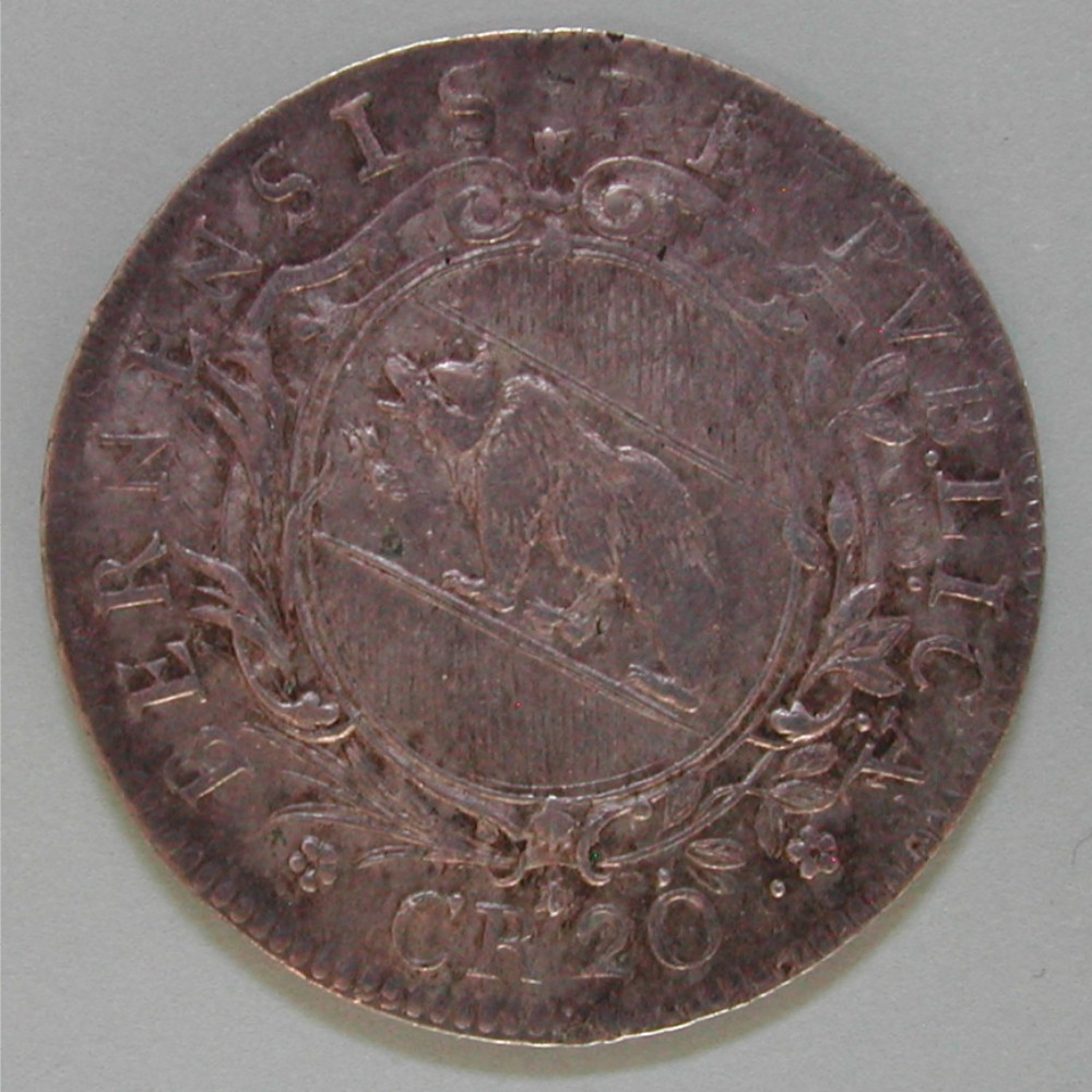 AS: REIPUBLICÆ – BERNENSIS, ovales Wappen mit Guirlanden und Pflanzenzweigen, unten: ✿ CR 20 ✿