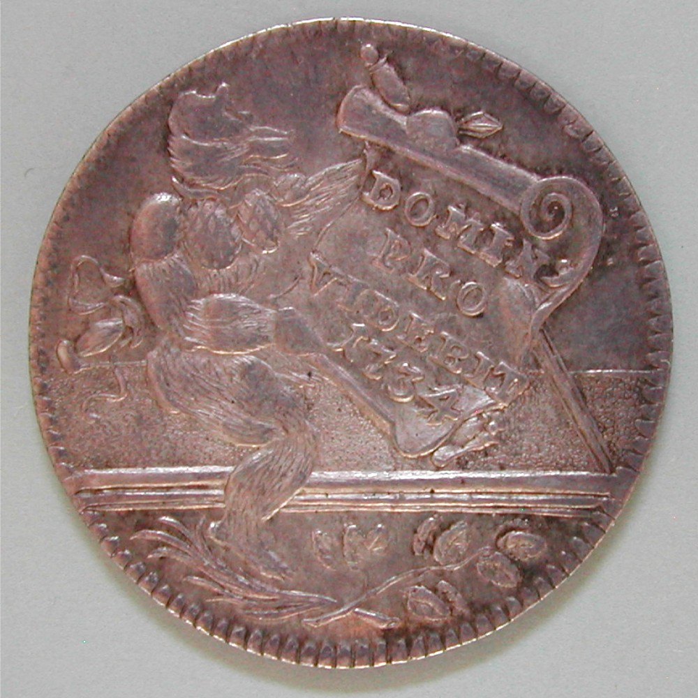 RS: Auf Estrade nach rechts sitzender Bär mit Brustpanzer hält Schriftrolle: DOMIN❜ / PRO / VIDEBIT / 1734, dahinter 2 gekreuzte Schwerter, unten Pflanzenzweige