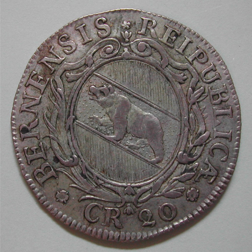 AS: REIPUBLICÆ ✿ BERNENSIS ✿ CR 20 ✿, ovales Wappen mit Guirlanden Kartusche, Felder senkrecht schraffiert, Mitte gepunktet