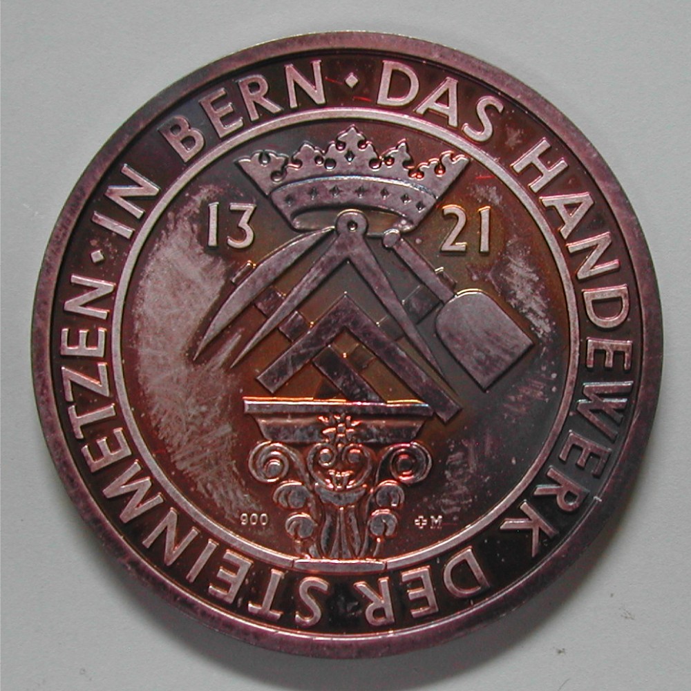 RS: DASHANDWERK DER STEINMETZEN • IN BERN •, Krone zwischen 13 – 21, Werkzeuge, Säulenkopf, links 900, rechts ✚ M