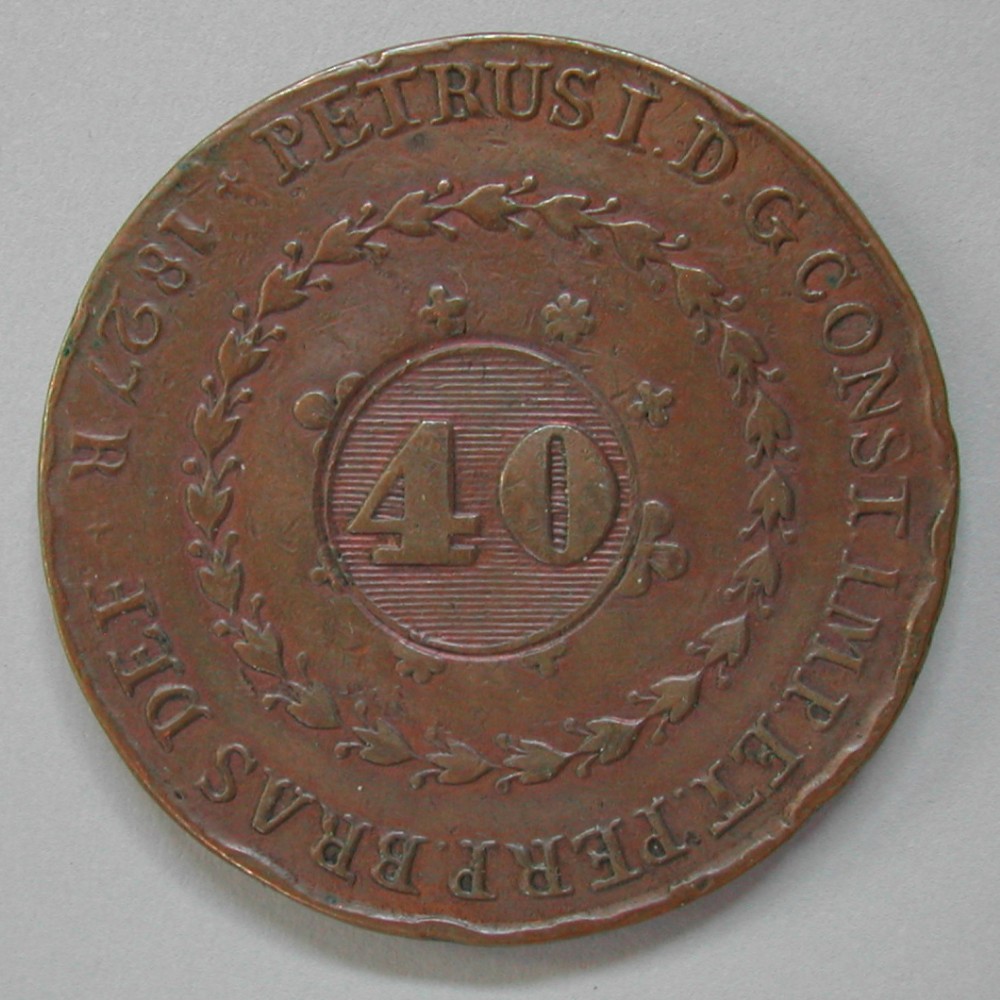 AS: PETRUS I. D. G CONST.IMP.PERP..BRAS.DEF + 1827 R +, c/ 40 im Kreis mit waagrechten Linien, mittig, darum Lorbeerkranz