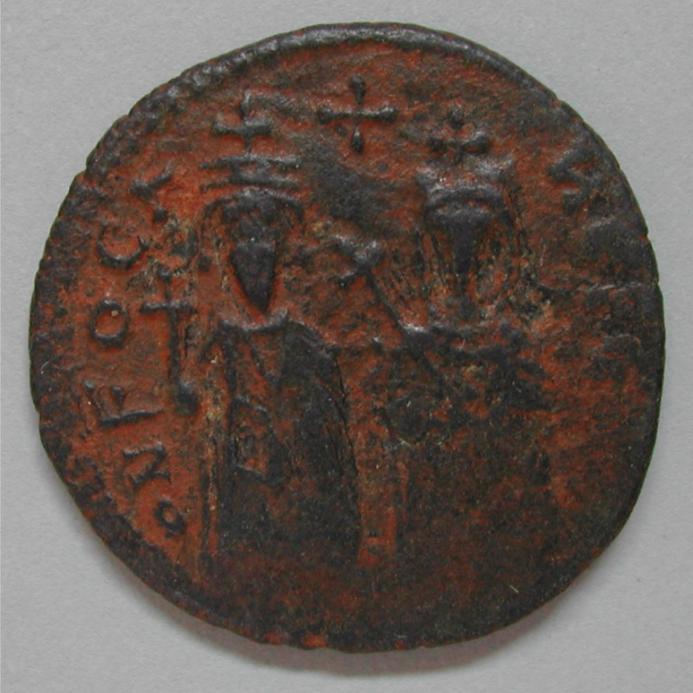 AS: O N FOCA NE PC AV (oder so) Phocas links + Leontia rechts frontal stehend halten Reichsapfel mit Kreuz