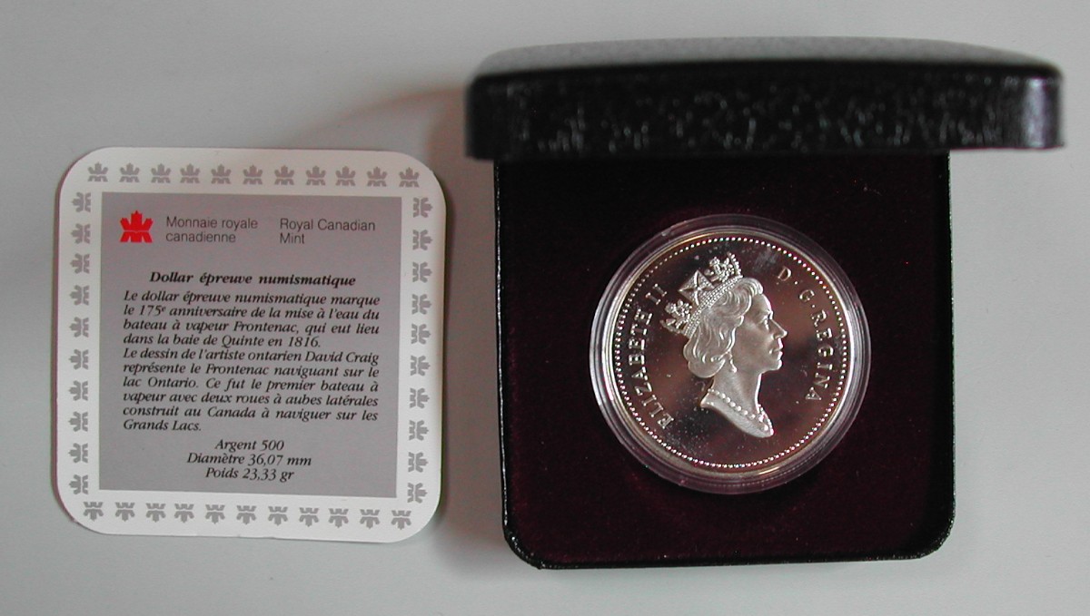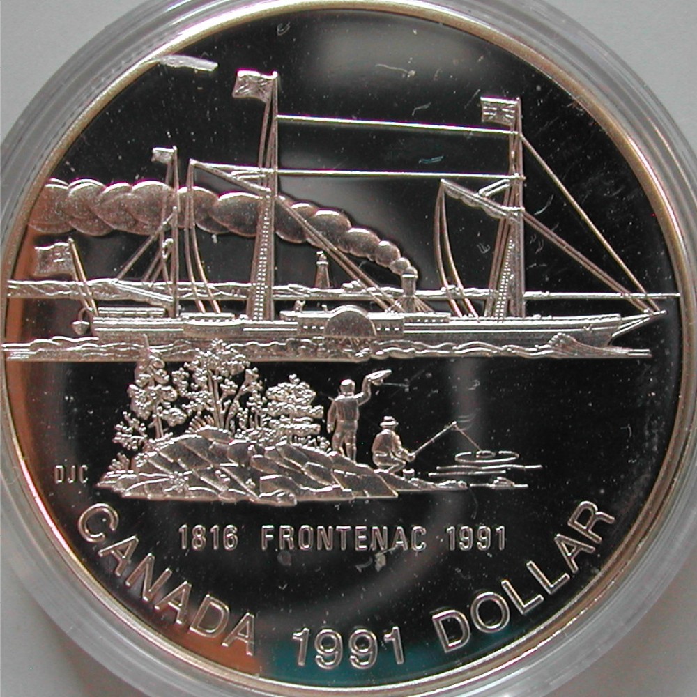 RS: Steamboat nach rechts vor Insel mit winkenden Personen, 1816 FRONTENAC 1991, CANADA 1991 DOLLAR