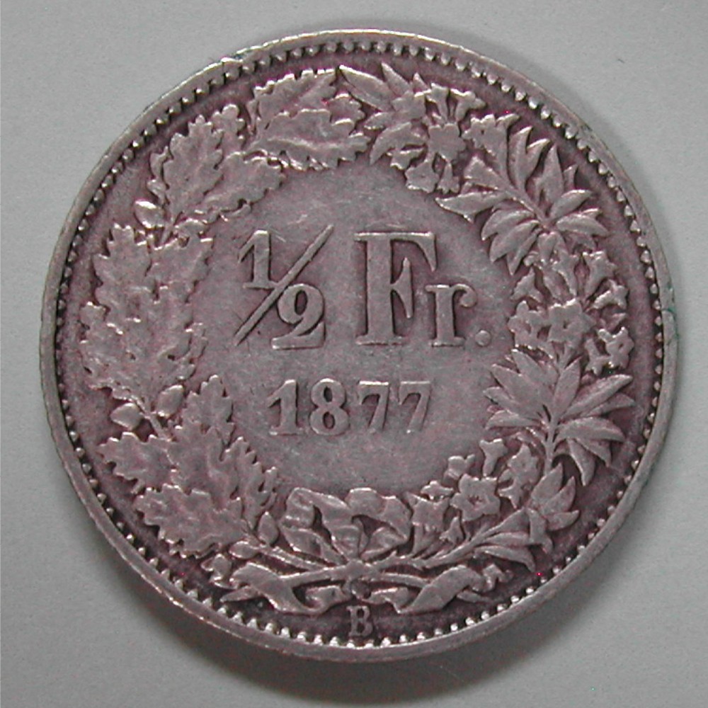RS: ½ Fr. / 1877 im Eichenlaubkranz, unten: B, ABART: Stempelriss senkrecht rechts von B