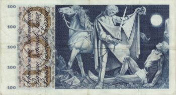 RS: links grosse 100 und Texte, grosses Bild des Heiligen Martin seinen Mantel mit Bettler teilend