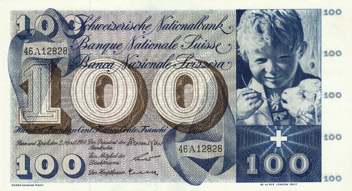 AS: grosse 100 links mit Texten, Nummern etc, rechts Knabe füttert Lamm mit Edelweiss Blume