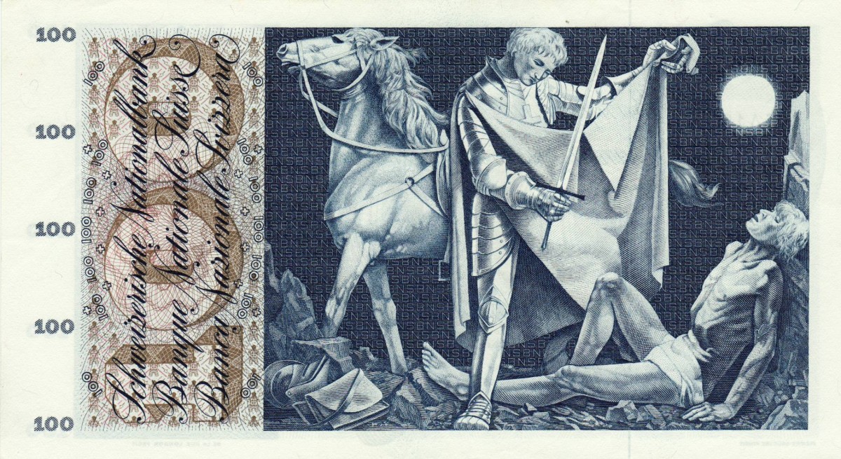 RS: links grosse 100 und Texte, grosses Bild des Heiligen Martin seinen Mantel mit Bettler teilend