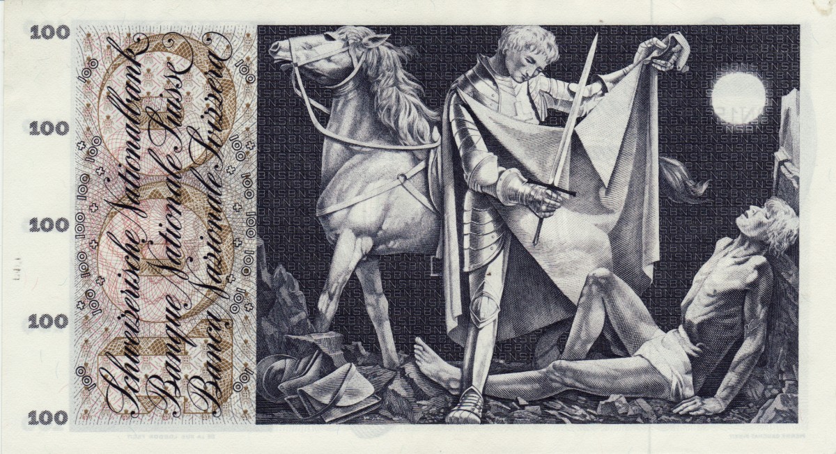 RS: links grosse 100 und Texte, grosses Bild des Heiligen Martin seinen Mantel mit Bettler teilend
