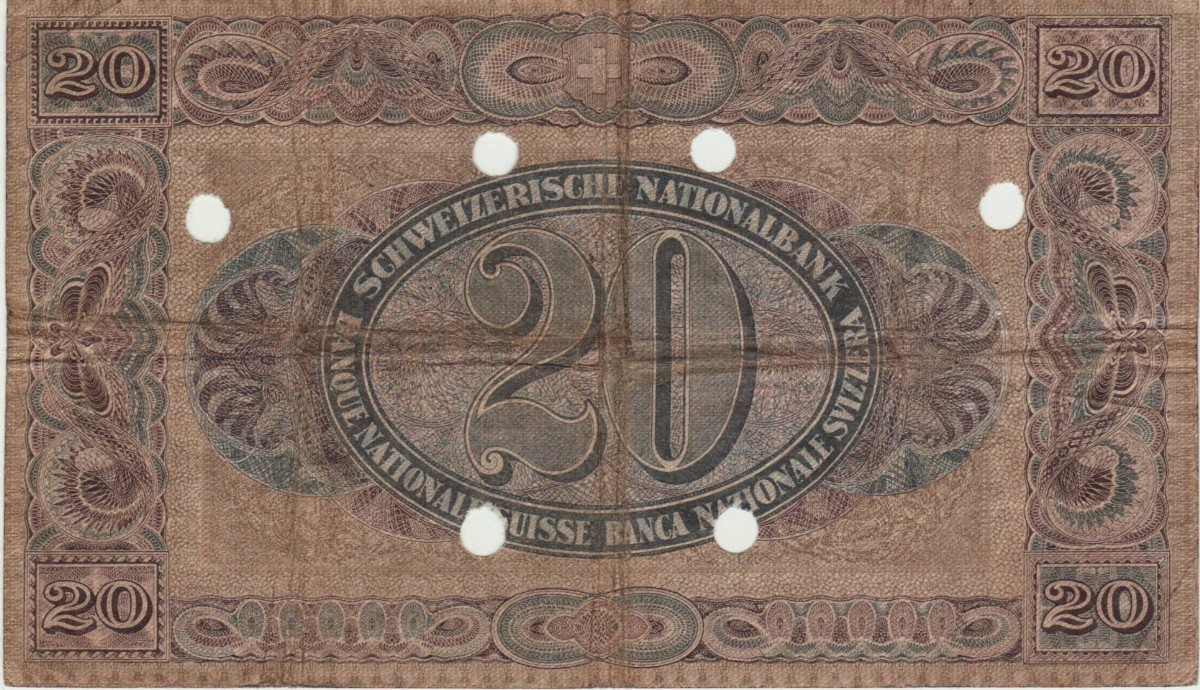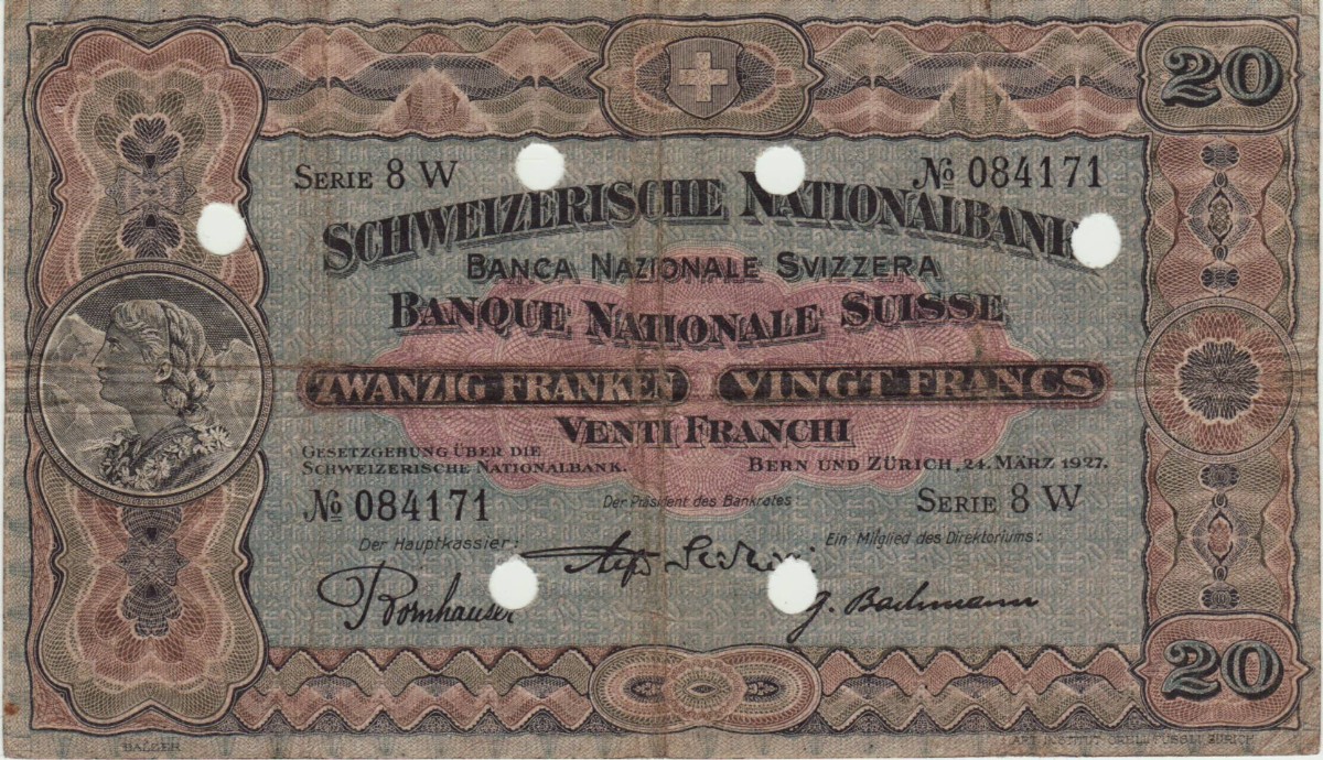 CH, 20 FRANKEN 1927, 24.03.27, gebraucht, entwertet gelocht in GB, SERIE 8 W N°084171
