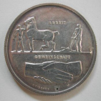 AS: ARBEIT / Bauer führt Pferd nach links dahinter Bauer am Pflug / GEMEINSCHAFT / Handschlag / sig: F.FISCHER HF