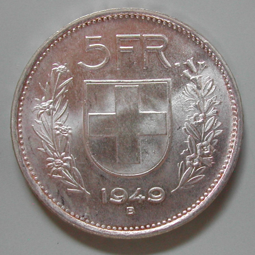 RS: 5 FR. / Wappen zwischen Alpenrosen und Edelweiss / 1949 / B