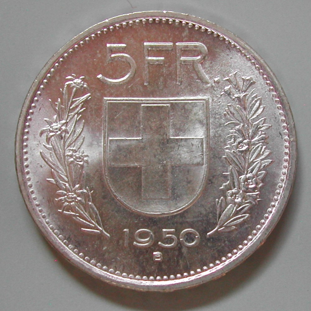 CH, 5 FRANKEN 1950 B, SILBER, unz