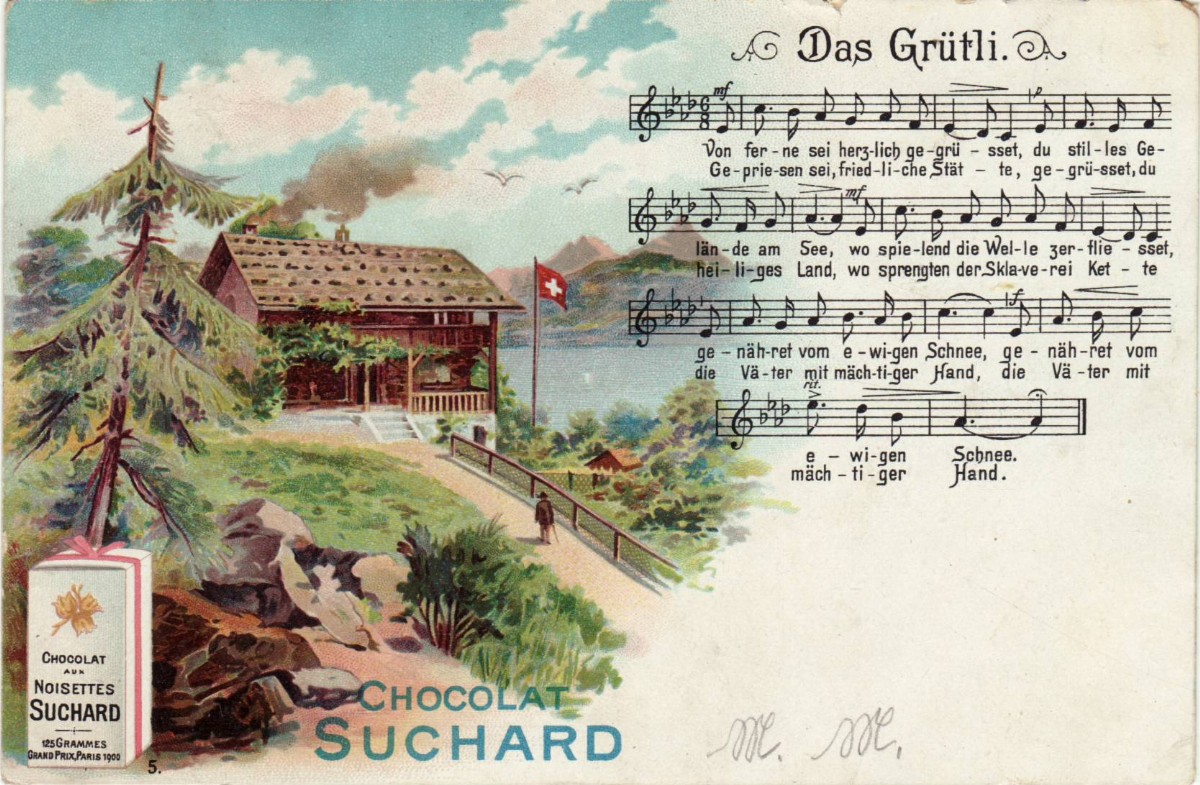 AS: Chalet in den Bergen, CHOCOLAT / SUCHARD, desgl. auf Paket links, Vermerk: Grand Prix 1900 Paris, rechts: Das Grütli, Noten und Text