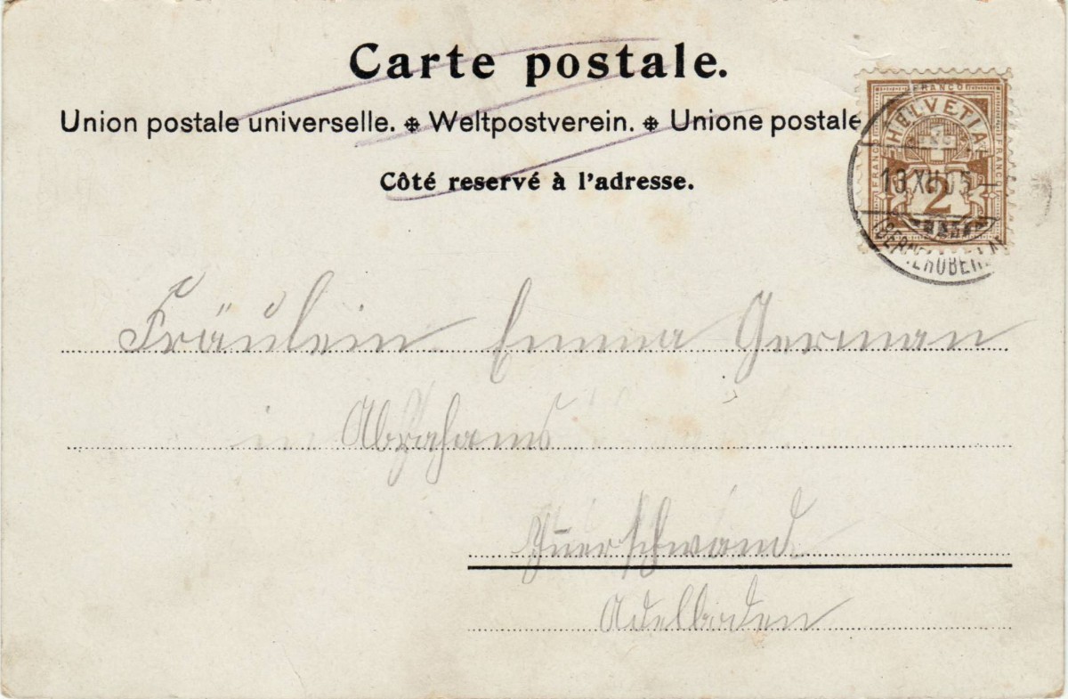RS: UPU, frankiert mit 2 Cts Ziffer olivbraun, Z Nr 58B, ⨀ ADELBODEN – (BERNER OBERLAND) – 13.XII.05. –