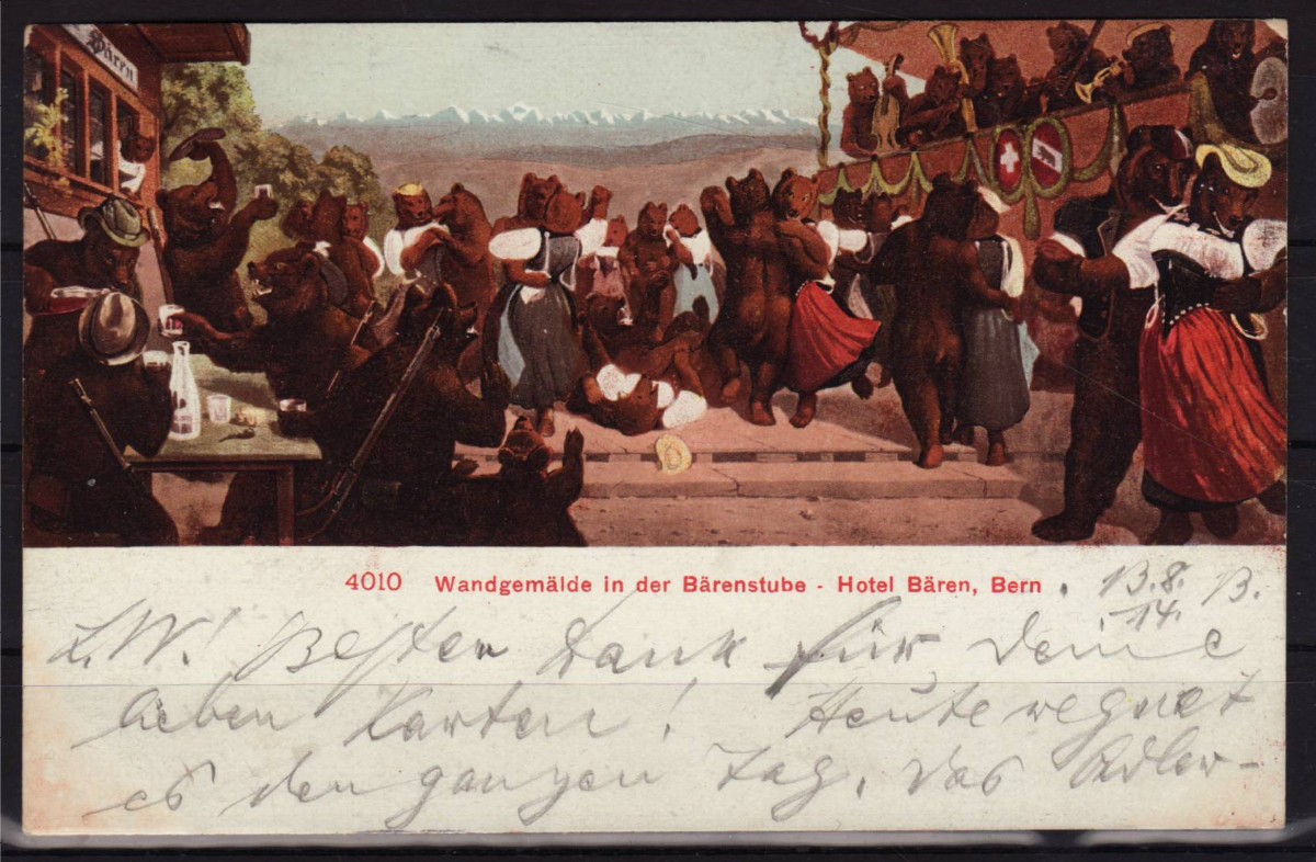 AS: Bären in Berner Tracht tanzen, musizieren und sind fröhlich, Szene irgendwo im Oberland, Berge im Hintergrund