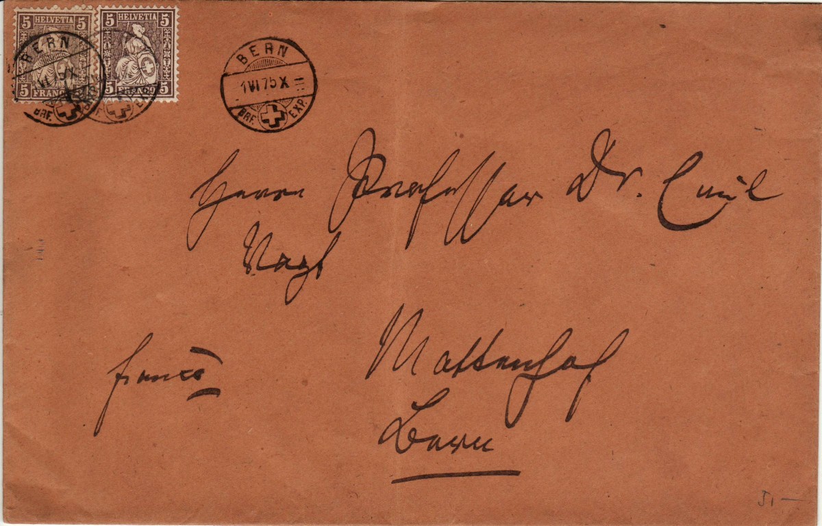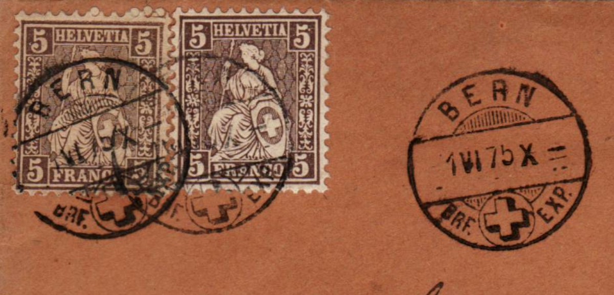 AS: 2 x sitzende Helvetia 5 braun (Farbnuancen) mit Brücken-⨀ BERN / 1 VI 75 X – / BRF. ✚ EXP.