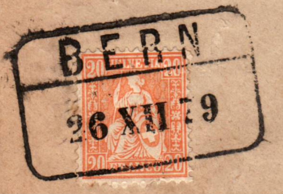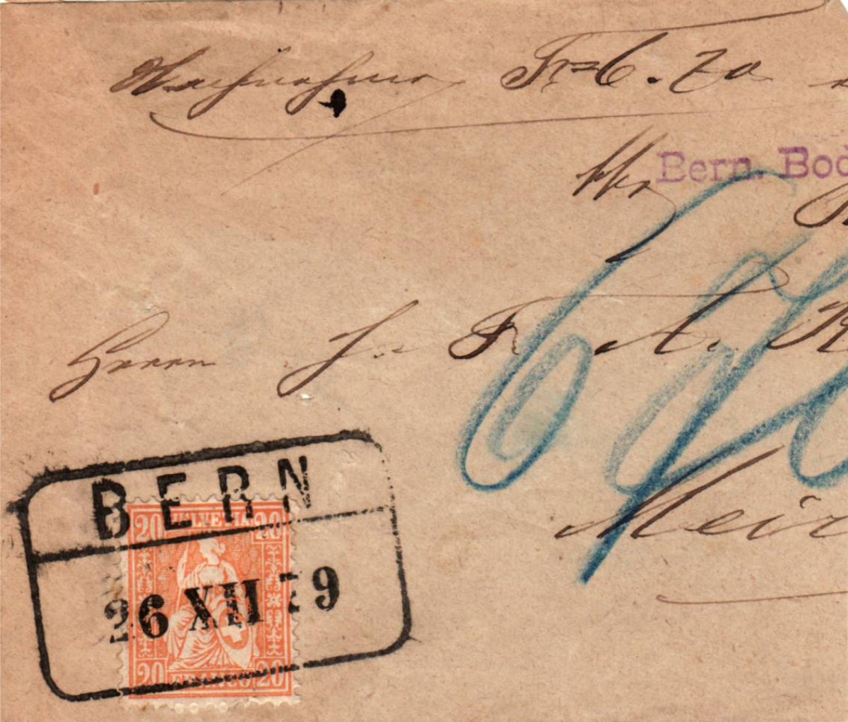 AS: Saubere Frankatur mit sitzender Helvetia 20 orange von 1862, sauber gestempelt BERN / 26 XII 79 im Rechteck, blaue Vermerke handschriftlich
