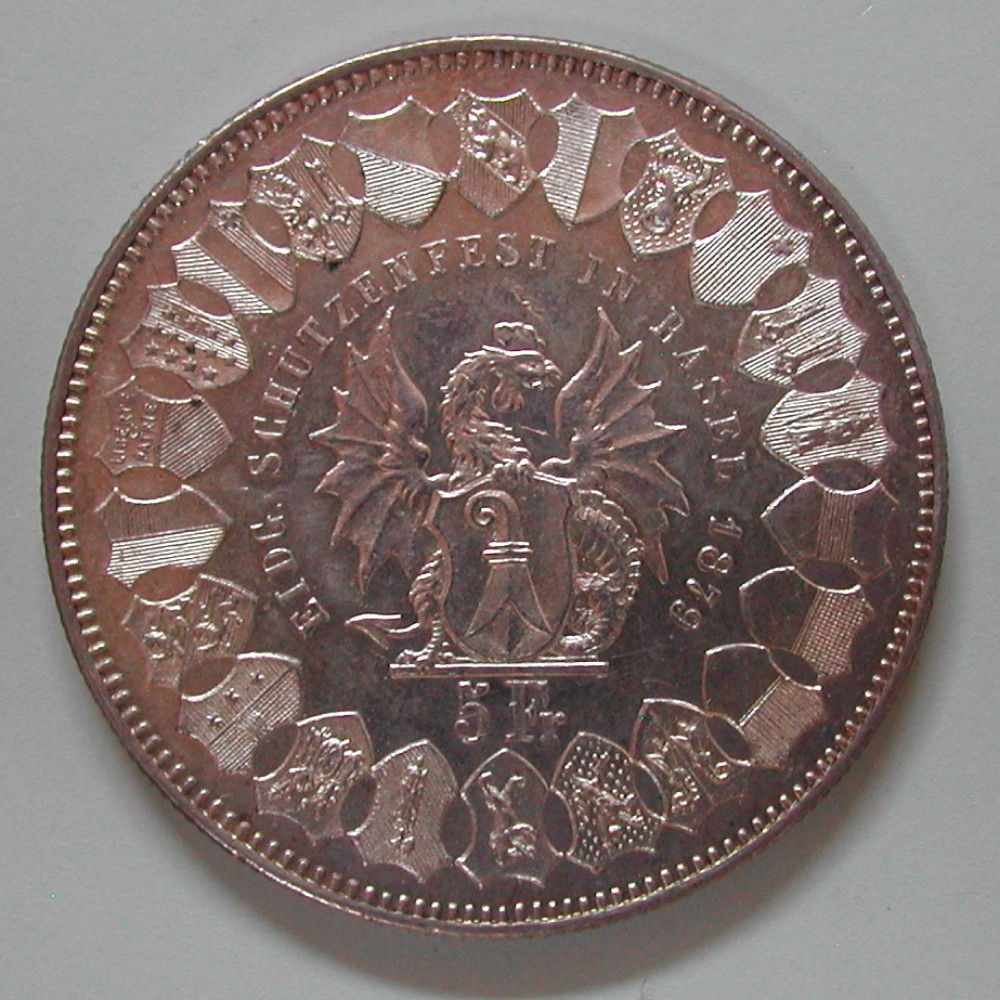 AS: Kranz aus Kantonswappen, EIDG. SCHÜTZENFEST IN BASEL 1879, Vogel Gryff mit Wappenschild, darunder: 5 Fr