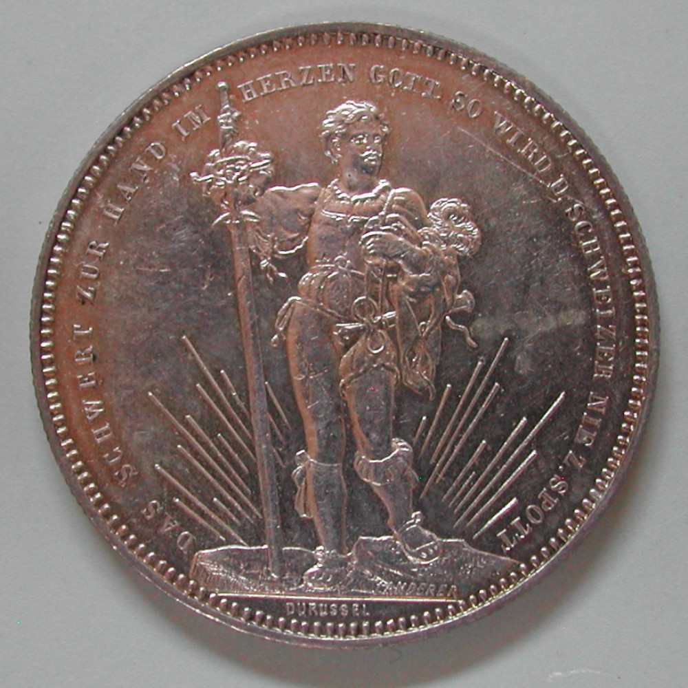 RS: DAS SCHWERT ZUR HAND IM HERZEN GOTT. SO WIRD D. SCHWEIZER NIE Z. SPOTT, junger Landsknecht mit langem Schwert vor Strahlen stehend, sig: DURUSSEL