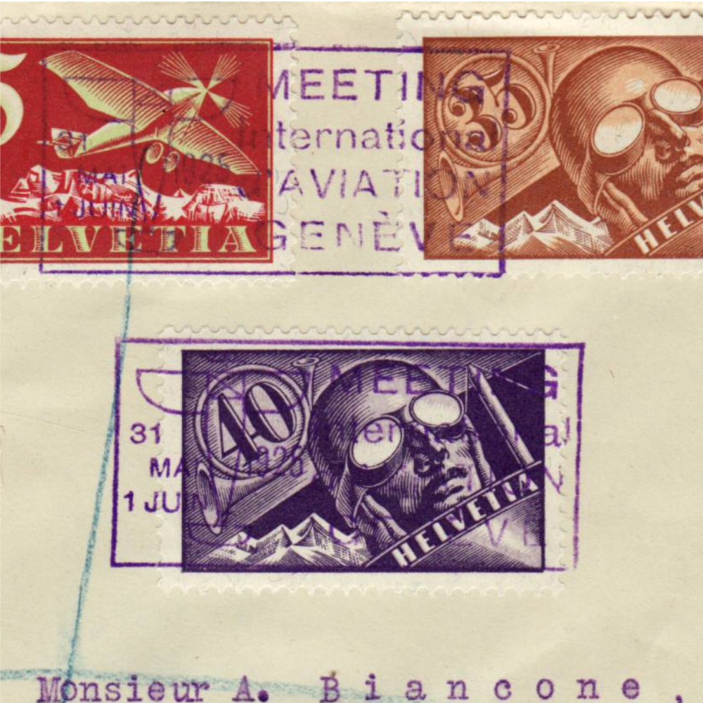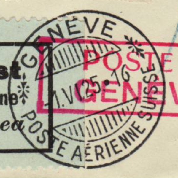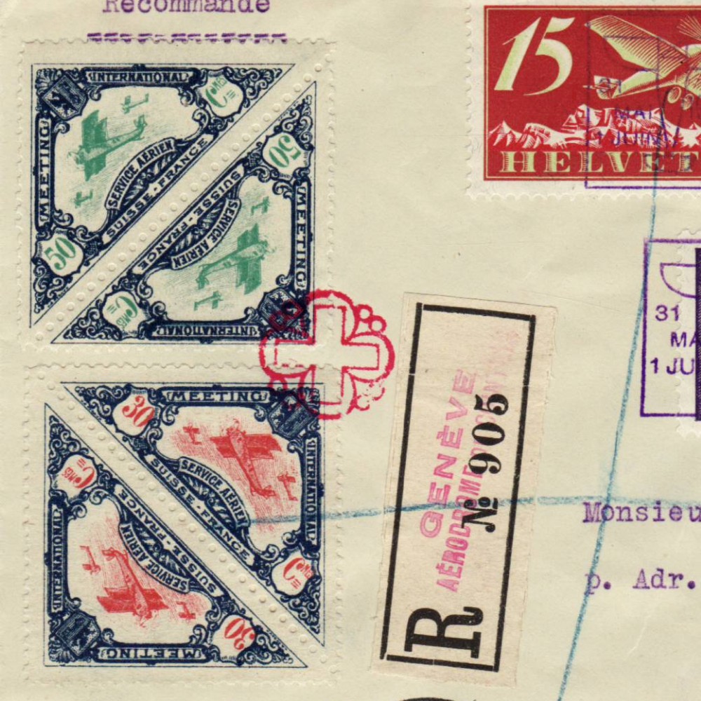 AS: links F-Zuschlagsmarken △ je im Paar, roter ⦿, FLUG CH Z 3, 6 + 7, spez-◻︎⦿ MEETING + ⦿ GENÈVE – POSTE AÉRIENNE SUISSE, -1.VI.25•16, nach Coulsdon GB