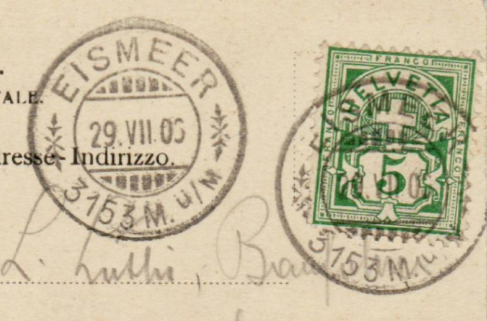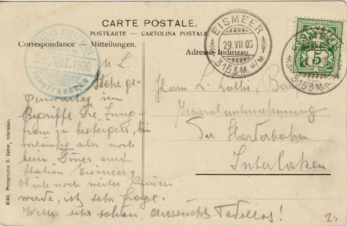 RS: Marke Ziffer 5 Cts grün, Z Nr 65B (1899) oder 82 (1906), ⨀ EISMEER – 3153 M.ü/M -, 29.VII.06, plus hellblauer Sonder-⨀ teils unleserlich / JUNGFRAUBAHN, 29.VII.1906