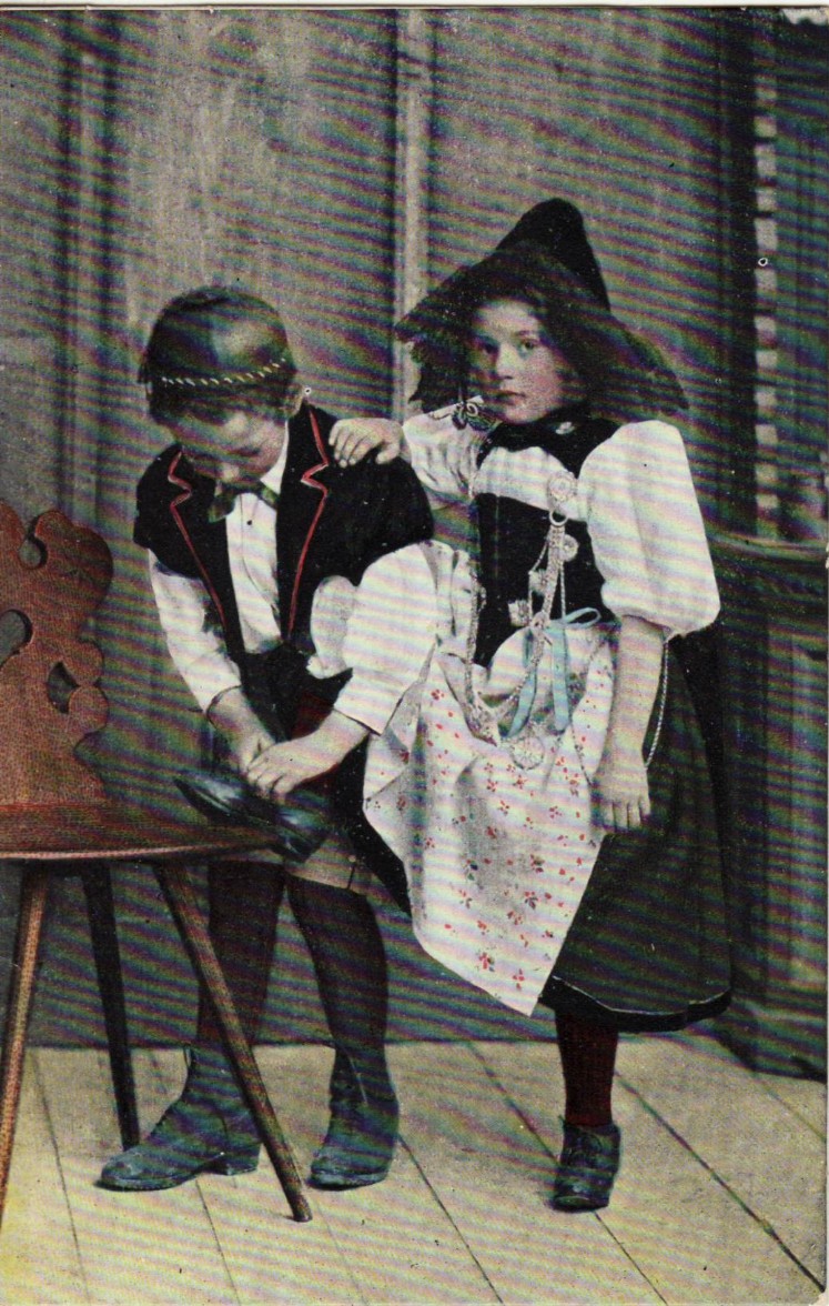 AS: Knabe bindet den Schuh eines Mädchens, beide in Tracht in Bauernstube