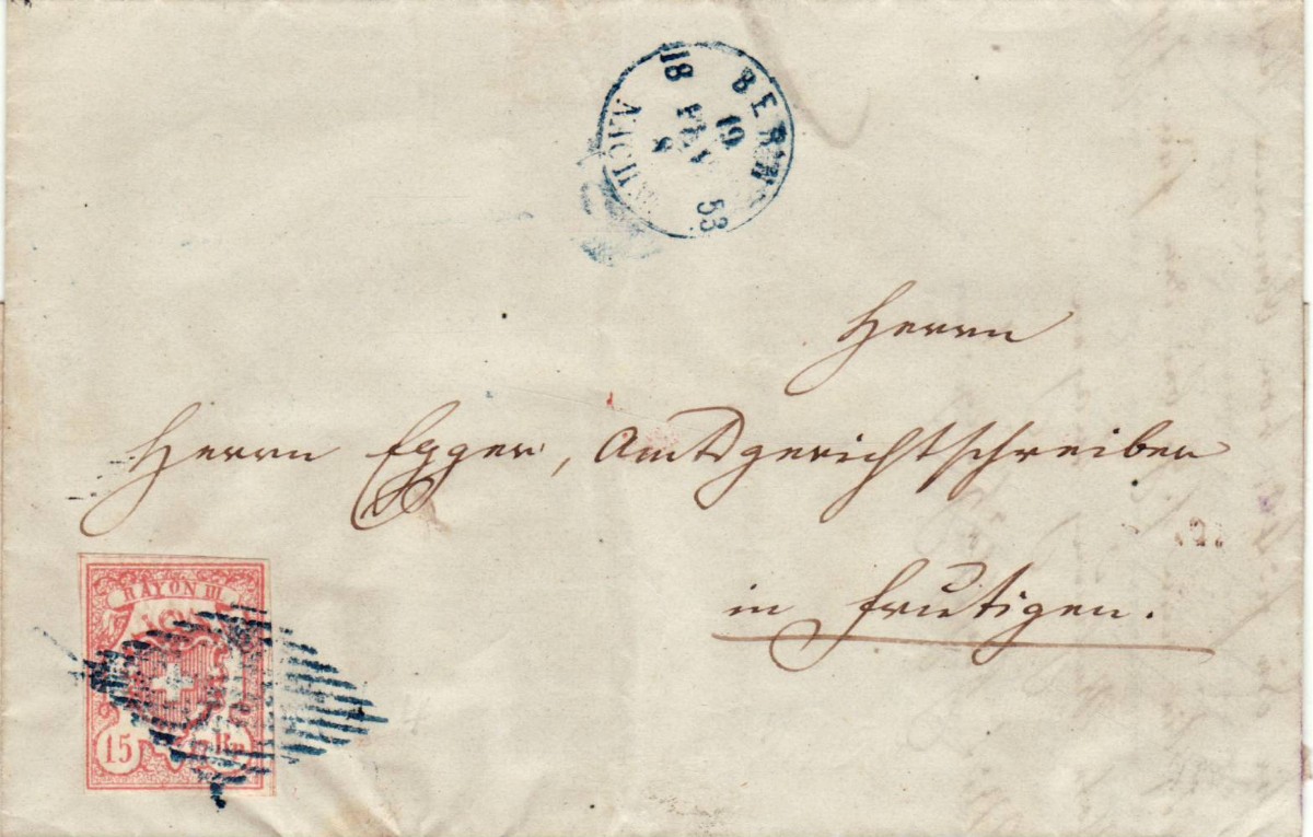 AS: RAYON III, 15 Rp, vollrandig mit blauer Raute entwertet, ⨀ BERN /19 / 18 FEV 53 / 8 / NACHM, blau, Einkreis