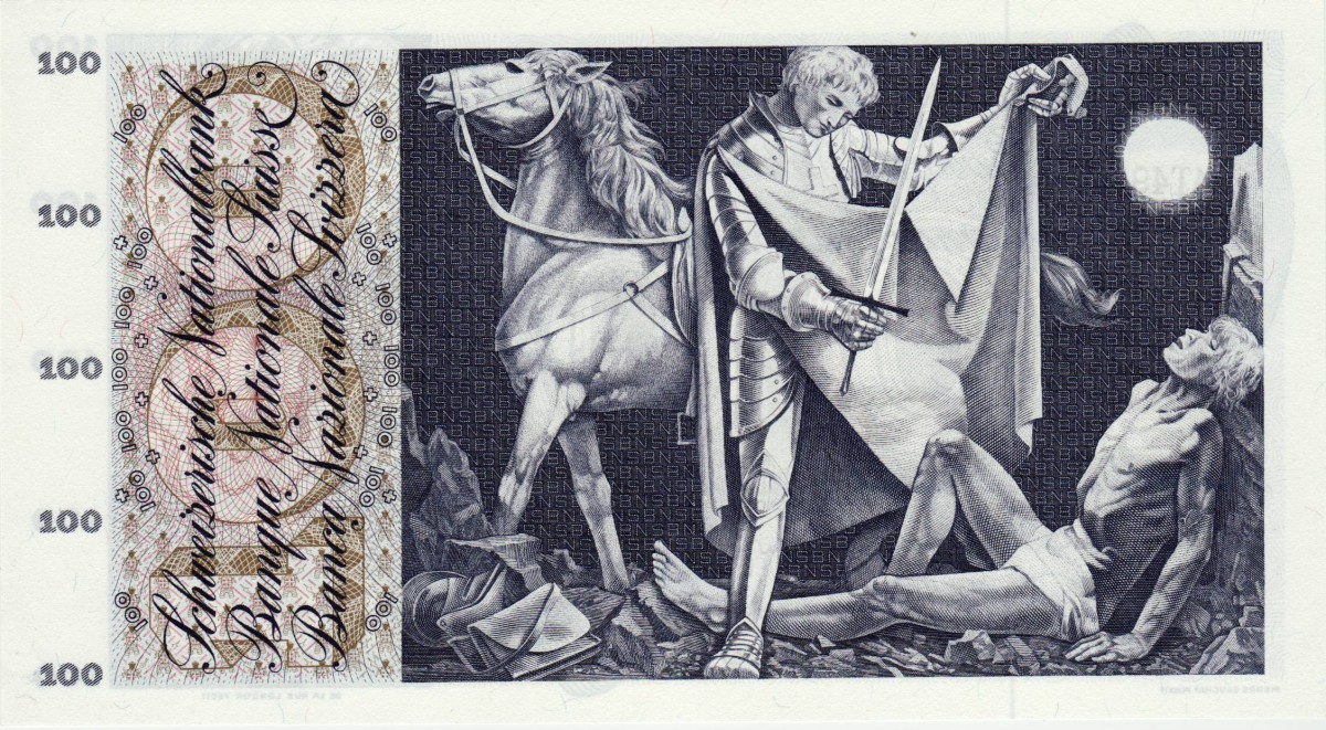RS: links grosse 100 und Texte, grosses Bild des Heiligen Martin seinen Mantel mit Bettler teilend