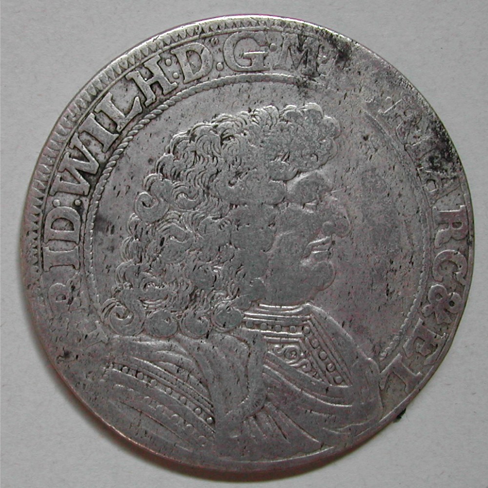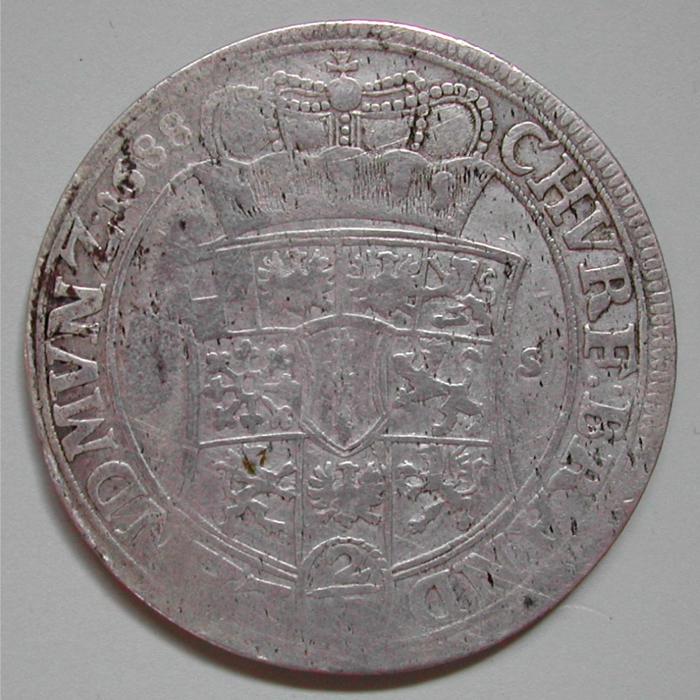 RS: CHVRF:BRAND – LANDMVNZ•1688, gekröntes, mehrfeldiges Wappen im Schnurkreis, unten in ovaler Kartusche: 2/3