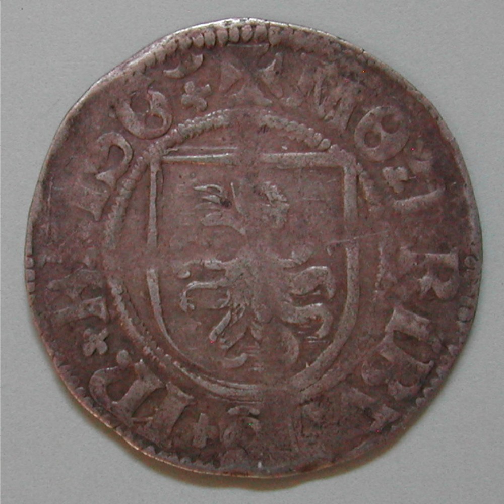 AS: MO’☘︎FRIBVRG+IN+BRISG’+✠, Wappen Rabe nach links im Perlkreis, Kreuz von RS durchgeschlagen